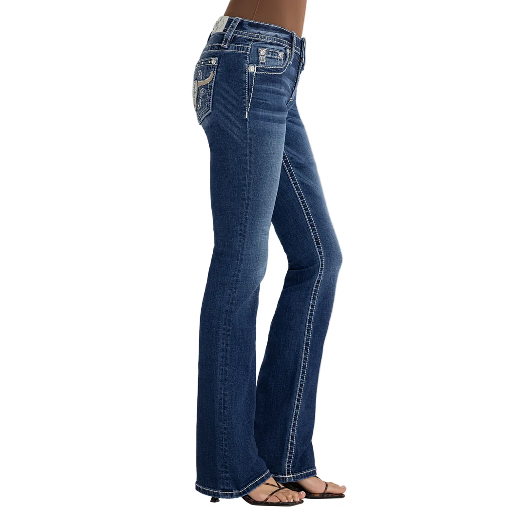 Rock & Roll Denim Women's Leather Embroidered Pocket Modest Bootcut Jeans